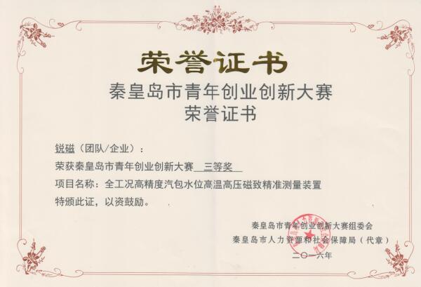 2016年5月,公司組建了“銳磁”和“新媒體”兩個團隊,參加秦皇島市青年創(chuàng)業(yè)創(chuàng)新大賽,其中“銳磁”團隊的參賽項目為《全工況高精度汽包水位高溫高壓磁致精準測量裝置》,“新媒體”團隊的參賽項目為《煤倉綜合管理系統(tǒng)》,經(jīng)過兩個團隊的不斷開拓創(chuàng)新,兩個項目先后在市級、省級及國家級的比賽中連獲殊榮?!度r高精度汽包水位高溫高壓磁致精準測量裝置》獲得秦皇島市青年創(chuàng)業(yè)創(chuàng)新大賽三等獎,第二屆“中國創(chuàng)翼”青年創(chuàng)業(yè)創(chuàng)新大賽高端設(shè)備制造類項“金翼獎”;《煤倉綜合管理系統(tǒng)》獲得秦皇島市青年創(chuàng)業(yè)創(chuàng)新大賽三等獎,河北省青年創(chuàng)業(yè)創(chuàng)新大賽三等獎,第二屆“中國創(chuàng)翼”青年創(chuàng)業(yè)創(chuàng)新大賽高端設(shè)備制造類項“銀翼獎”。