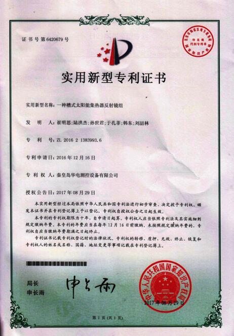【企業(yè)要聞】“一種槽式太陽能集熱器反射鏡組”頒發(fā)專利證書