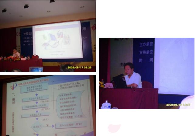 2009年5月16-17日,公司總經(jīng)理劉吉川安排我和崔明思應(yīng)中國(guó)知識(shí)產(chǎn)權(quán)研究會(huì)的邀請(qǐng),來(lái)到了美麗的西子湖畔杭州戴斯大酒店參加了“外觀設(shè)計(jì)專利申請(qǐng)、審查與侵權(quán)判定實(shí)務(wù)培訓(xùn)班”。