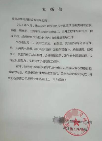 2018年5月18日,公司再次收到來自國電某發(fā)電廠的一封表揚信。信中,甲方對公司全體施工人員盡職盡責、積極主動、規(guī)范有序的態(tài)度和精神提出嘉許。信中提到:“在改造過程中,面對工期緊、任務重、受限空間等諸多因素,施工人員統(tǒng)一思想、精心組織管理,發(fā)揚艱苦奮斗、頑強拼搏、迎難而上、攻堅克難的戰(zhàn)斗精神,合理調配資源,強化安全質量管理、發(fā)揮團隊凝聚力,按期完成了各項施工任務?!?/FONT>
