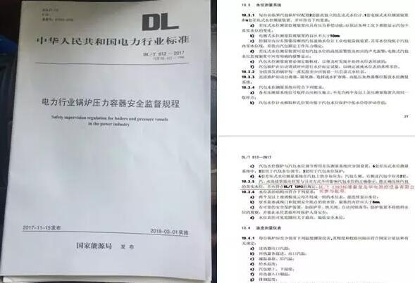 中華人民共和國電力行業(yè)標準《電力行業(yè)鍋爐壓力容器安全監(jiān)督規(guī)程》(DL/T 612-2017)(替代DL612-1996)于2017年11月15日由國家能源局發(fā)布,并于2018年3月1日實施。此規(guī)程規(guī)定了電力行業(yè)鍋爐壓力容器安全監(jiān)督要求,并在“10.安全保護裝置及儀表中10.3水位測量系統(tǒng)”引用了《火力發(fā)電廠鍋爐汽包水位測量系統(tǒng)技術規(guī)程》(DL/T1393-2014)部分內容進行系統(tǒng)闡述。