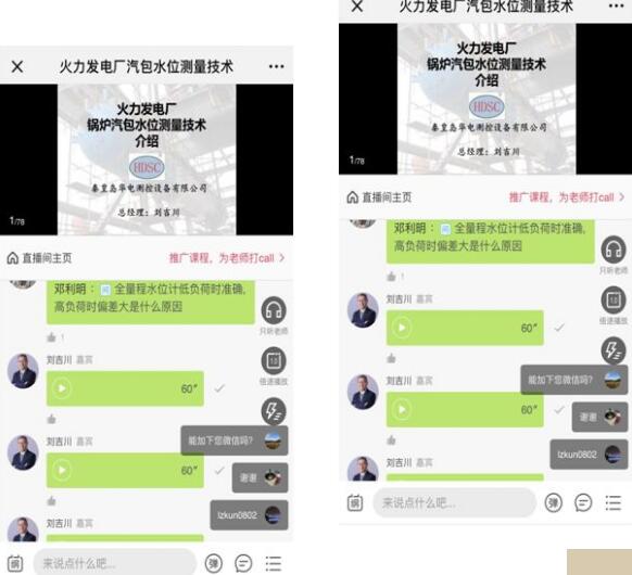 直播課程通過(guò)語(yǔ)音與PPT相結(jié)合,向大家詳細(xì)的講解了汽包水位測(cè)量系統(tǒng)技術(shù)規(guī)程的必要性、汽包水位測(cè)量系統(tǒng)改造必要性、汽包水位測(cè)量系統(tǒng)的問(wèn)題及技術(shù)難點(diǎn)、如何解決、改造效果。為大家分享經(jīng)驗(yàn),直播最后20分鐘劉吉川總經(jīng)理現(xiàn)場(chǎng)為熱控技術(shù)人員進(jìn)行答疑解惑,解決了他們心中的疑慮,得到了技術(shù)人員的積極響應(yīng)和高度評(píng)價(jià)。