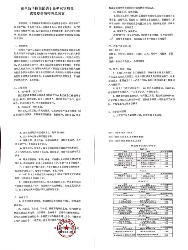 1月31日,根據(jù)河北省人民政府辦公廳下發(fā)的“關于延遲企業(yè)復工”的通知,秦皇島華控集團有限公司立即下發(fā)通知:將集團各下屬各分公司復工日期延長至2月10日。隨后集團再次下發(fā)通知,10號以后各分公司員工在家分散辦公、線上辦公,具體集中辦公時間等待通知,最大程度地降低員工間感染傳播的風險。