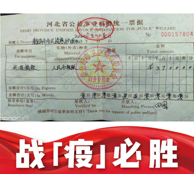 截止到2月9日捐款倡議結(jié)束,兩項捐款活動共計參與125人次,募集到了款項10500元,目前已將募集到的款項捐贈到了秦皇島市應對新型冠狀病毒感染的肺炎疫情工作領導小組辦公室公示的秦皇島市衛(wèi)生健康委員會賬戶上。