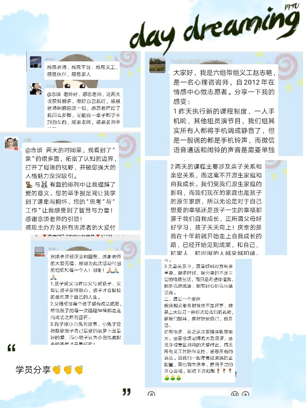 課程結(jié)束后看到大家都在群里分享自己的感想與收獲,讓我想起開課前臨時(shí)邀請(qǐng)擔(dān)任主持人,當(dāng)時(shí)的心情特別矛盾。有興奮,第一次上臺(tái)當(dāng)主持對(duì)自己是個(gè)很大的挑戰(zhàn);有心虛,非常不自信覺得自己做不好;有糾結(jié),因?yàn)楹⒆舆€有兩天時(shí)間就期末考試。最后我還是決定抓住機(jī)會(huì),做自己想做的,相信越努力越幸運(yùn),于是我就這樣在沒有任何準(zhǔn)備的情況下做了兩天的主持人。