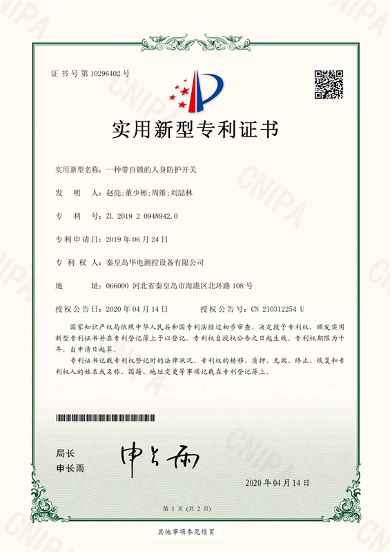 【企業(yè)要聞】公司申請的“一種帶自鎖的人身防護開關(guān)”獲頒專利證書